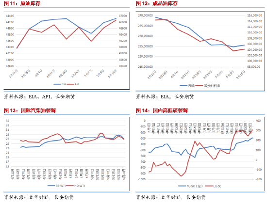 库存侧,原油方面,美国至5月16日当周API原油库存为249.9万桶,预期-144.9万桶,前值428.7万桶;同时5月16日当周EIA原油库存同步录得增加132.8万桶,预期-127.7万桶,前值345.4万桶。本轮库存数据再度录得了增加,这符合全球低库存的积累走势,同时这也对油价短线的反弹走势造成了压力,这一方面是由于美国产量及进口量的增加,另一方面则是受到了北美原油投产量下降的影响。在成品油方面,美国至5月16日当周汽油库存则录得为81.6万桶,预期-52.4万桶,前值-102.2万桶;同时精炼油库存录得为57.9万桶,预期-139.8万桶,前值-315.5万桶。本轮成品油库存则并没有得到进一步的去库,反而出现了小幅的累库,这导致北美汽油库存积累至今年1月底以来的最高水平,对汽油价格形成了明显的压制,这也将对内盘的高低硫盘面裂解形成一定的压力;但值得注意的是,随着季节推进,北美即将在三季度迎来汽油的消费旺季,这或导致后续北美的汽油价格依然存在明显的支撑力量,进而提振内盘燃料品种的盘面表现。